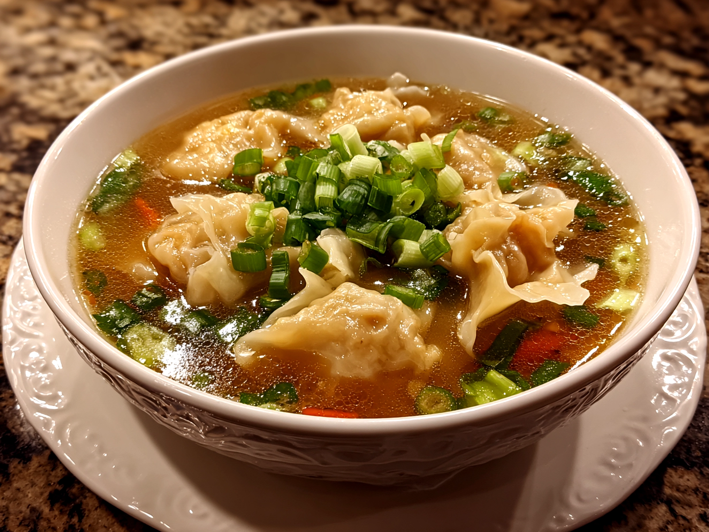 A warm and comforting Asian wonton soup featuring delicate handmade wontons, a fragrant savory broth, and a medley of fresh, crisp vegetables for a nourishing meal.