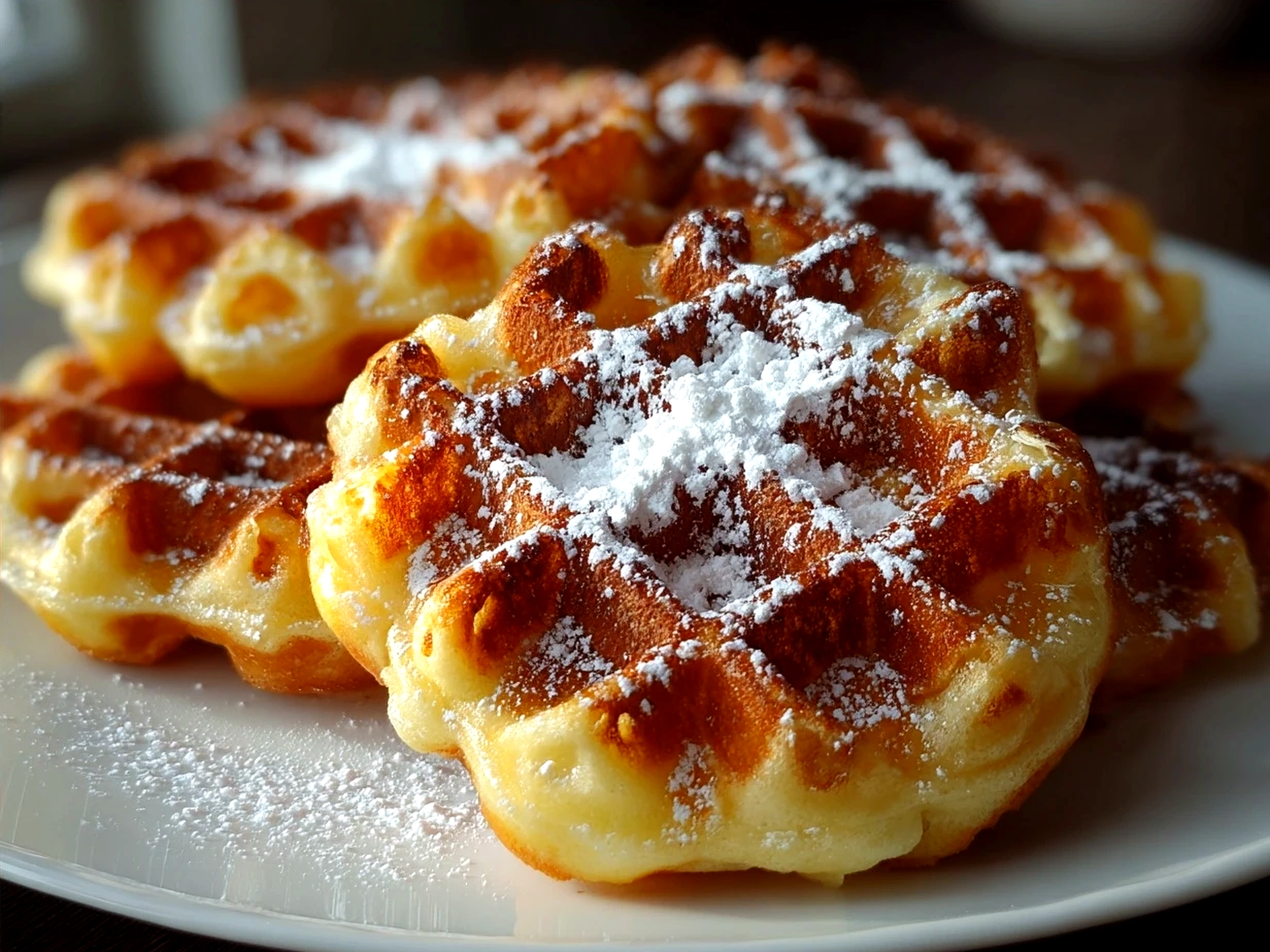 Light and fluffy Belgian waffles with a crisp golden exterior, perfect for a delicious breakfast or brunch treat.