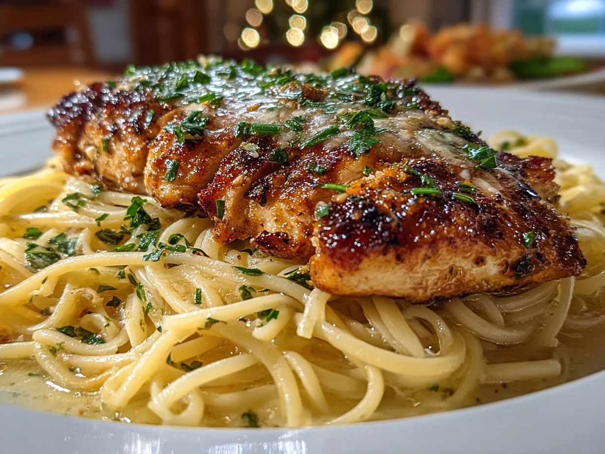 Final plated Chicken Piccata Pasta with lemon caper sauce and fresh parsley garnish