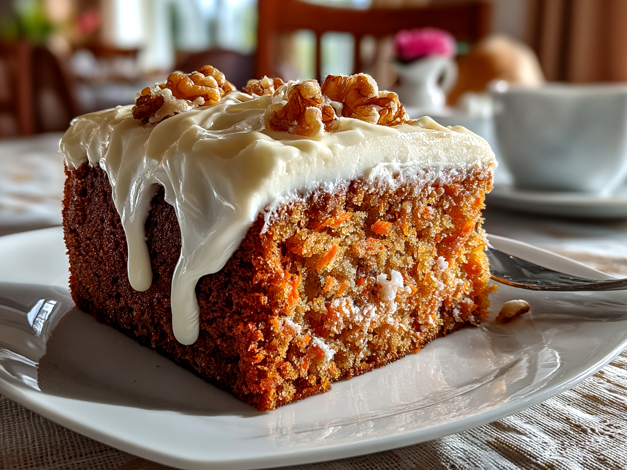 A moist and flavorful carrot cake spiced with cinnamon and nutmeg, topped with creamy cream cheese frosting. Perfectly balanced sweetness and texture make it a classic favorite dessert.