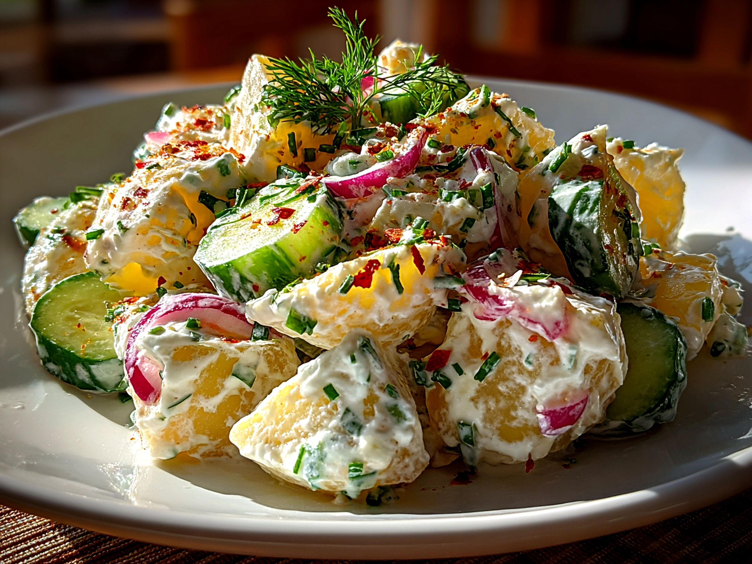 A refreshing twist on classic potato salad featuring creamy Greek yogurt and crisp cucumbers for a light, healthy side dish perfect for any occasion.