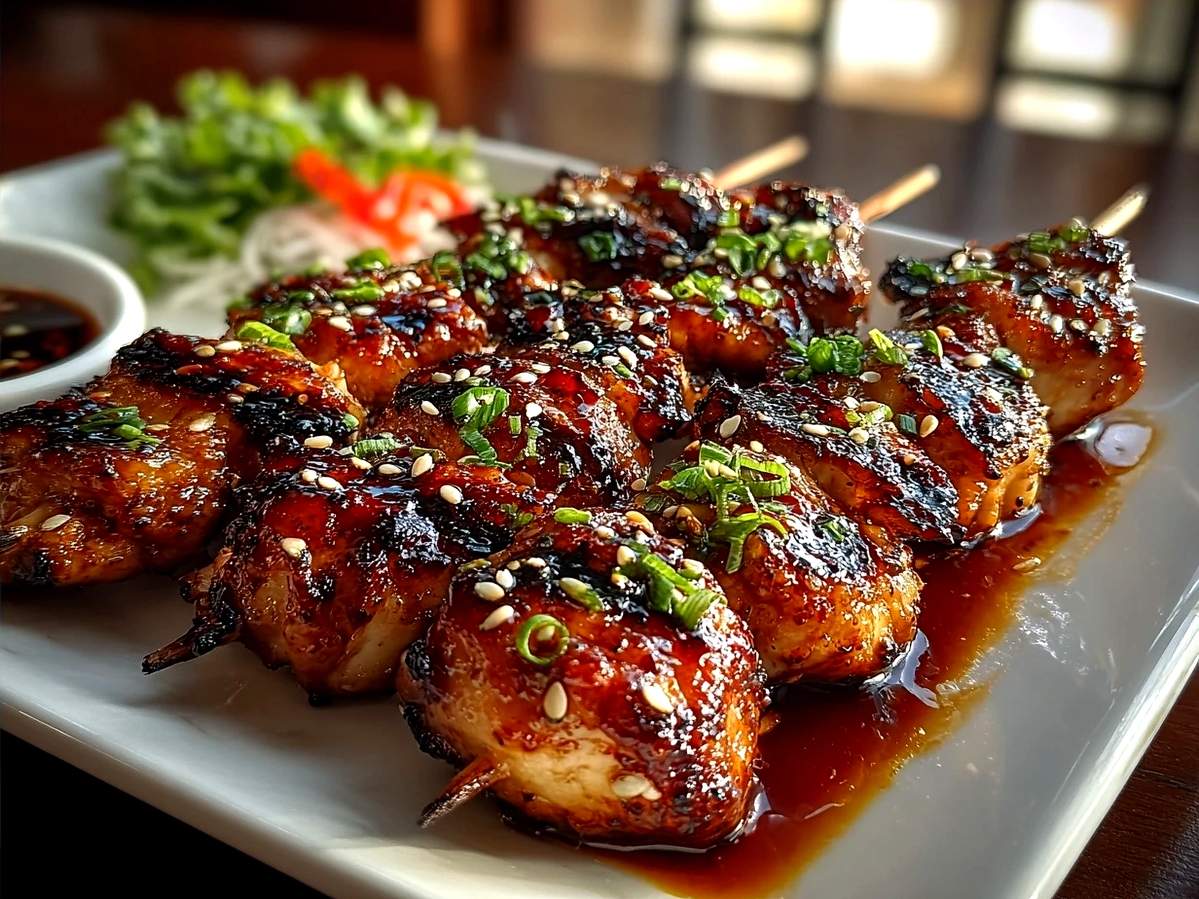 Deliciously tender Japanese Yakitori grilled chicken skewers glazed with a savory-sweet sauce, perfect for a flavorful appetizer or main dish.