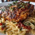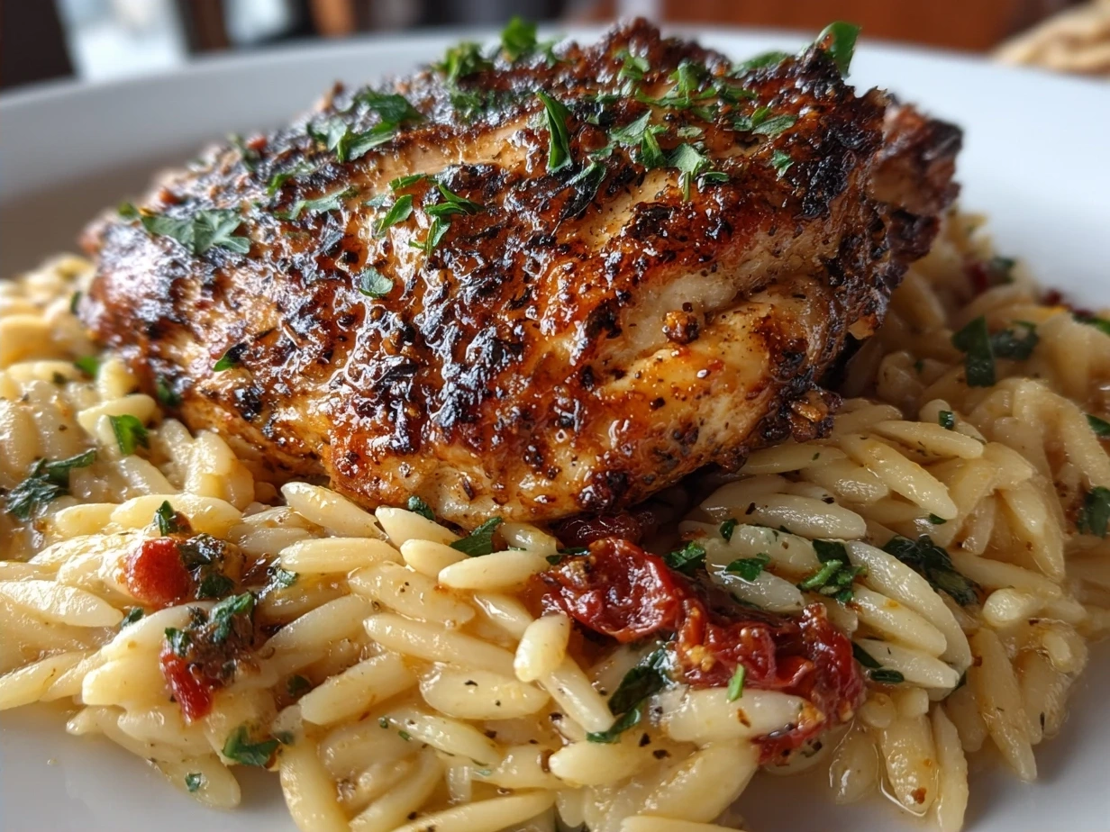 A vibrant and flavorful Mediterranean Chicken and Orzo dish combining tender chicken, tangy tomatoes, olives, and fresh herbs for a wholesome meal.