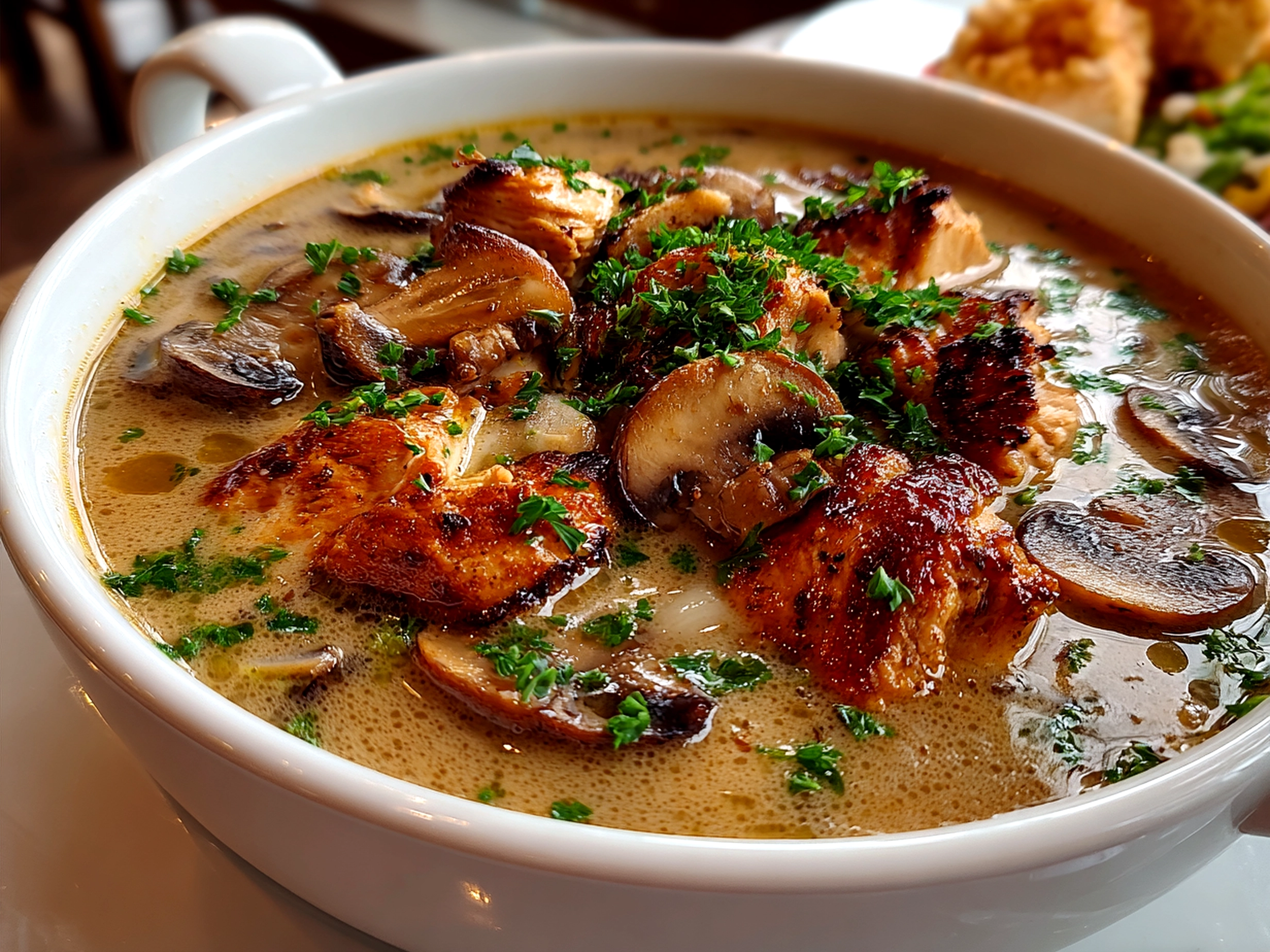 8. Serve hot, sprinkled with fresh parsley. If you’re curious to see another take on creamy chicken soup, this cozy creamy chicken and mushroom soup from Little Broken is a fantastic inspiration that complements your rotisserie chicken and mushroom soup skills.