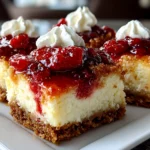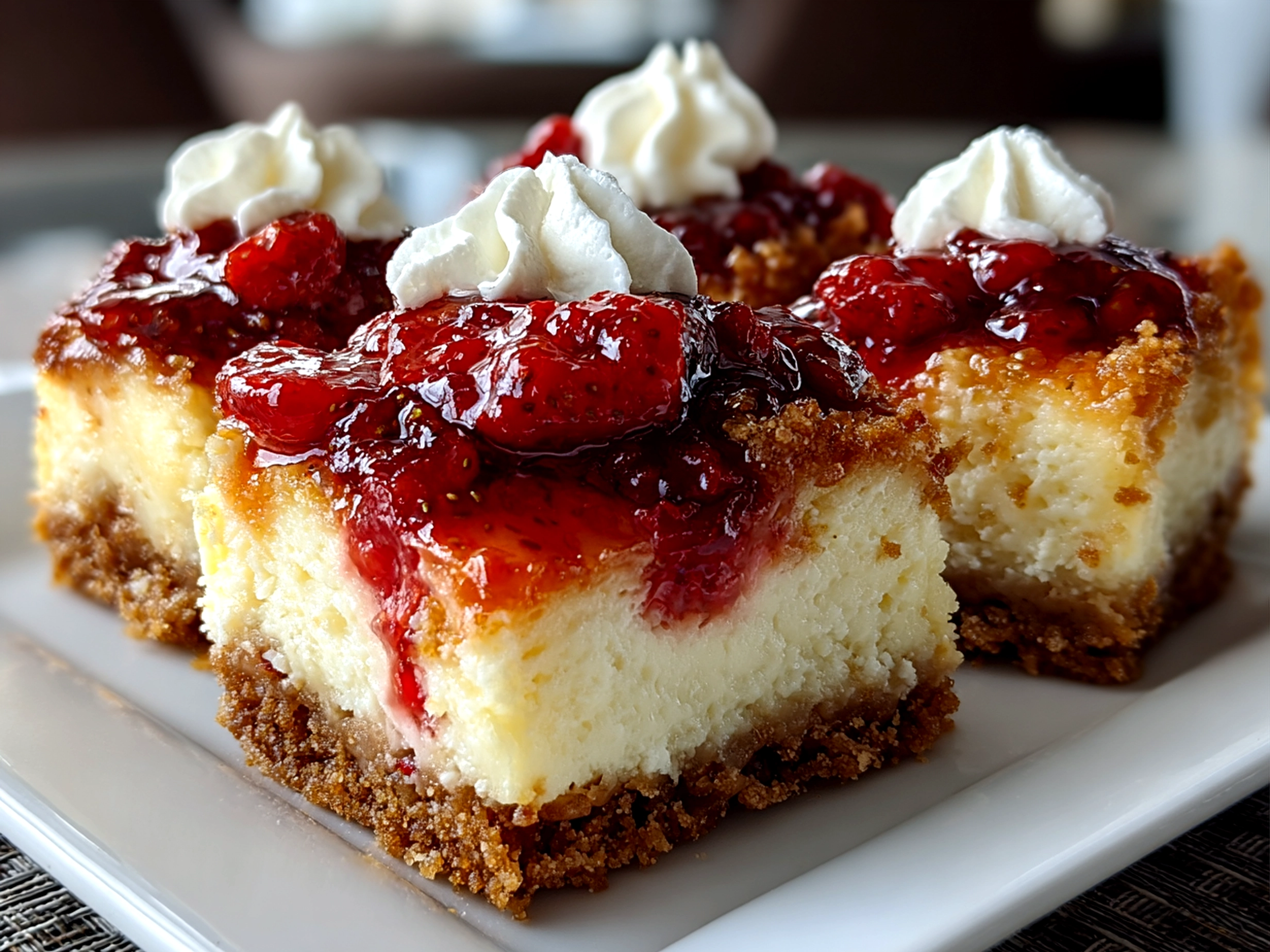 Deliciously creamy strawberry cheesecake bars with a buttery crust and fresh strawberry topping, perfect for a sweet dessert or snack.