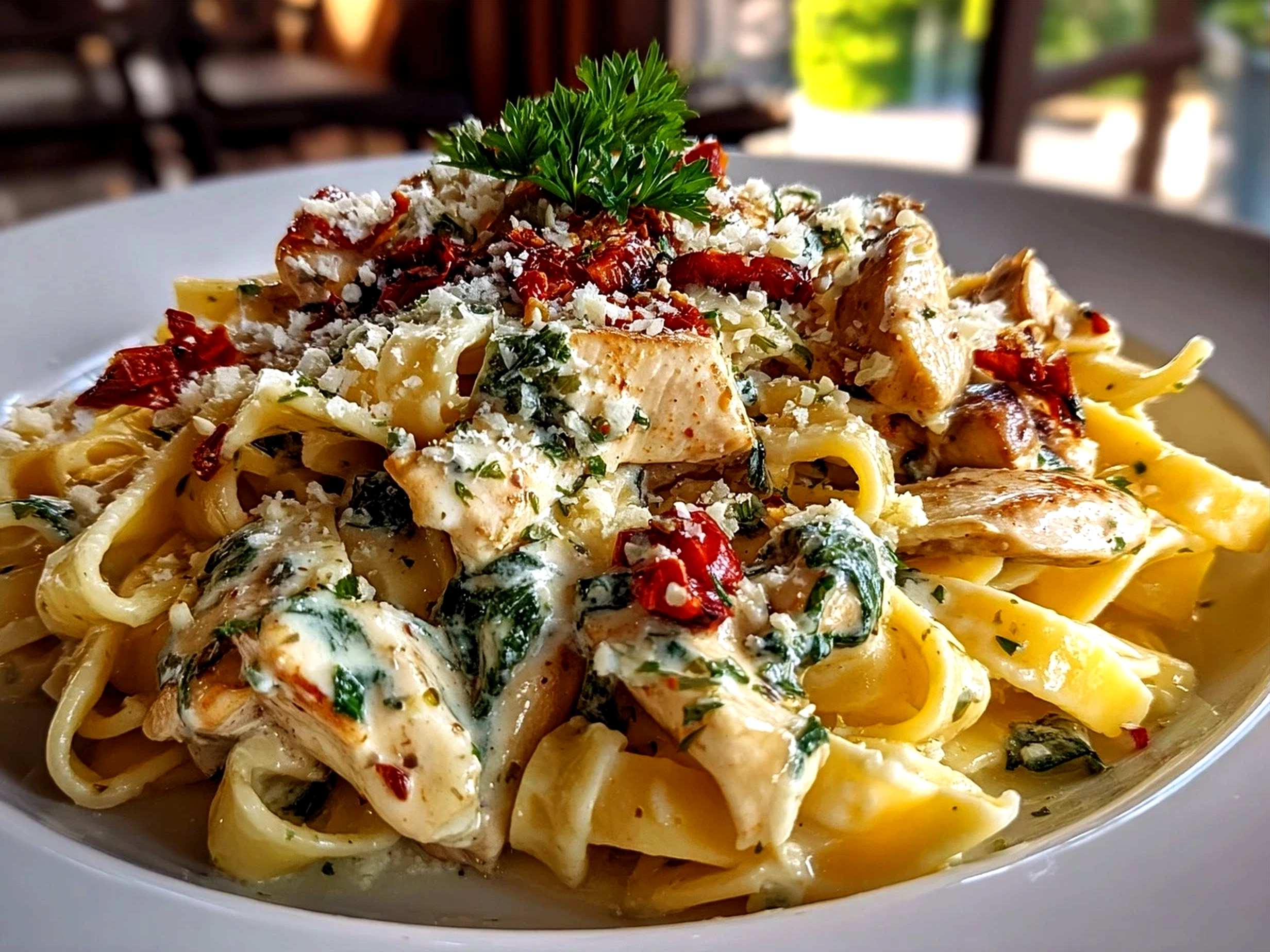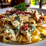 A creamy and flavorful Tuscan chicken pasta featuring tender chicken, sun-dried tomatoes, spinach, and a rich garlic parmesan sauce.