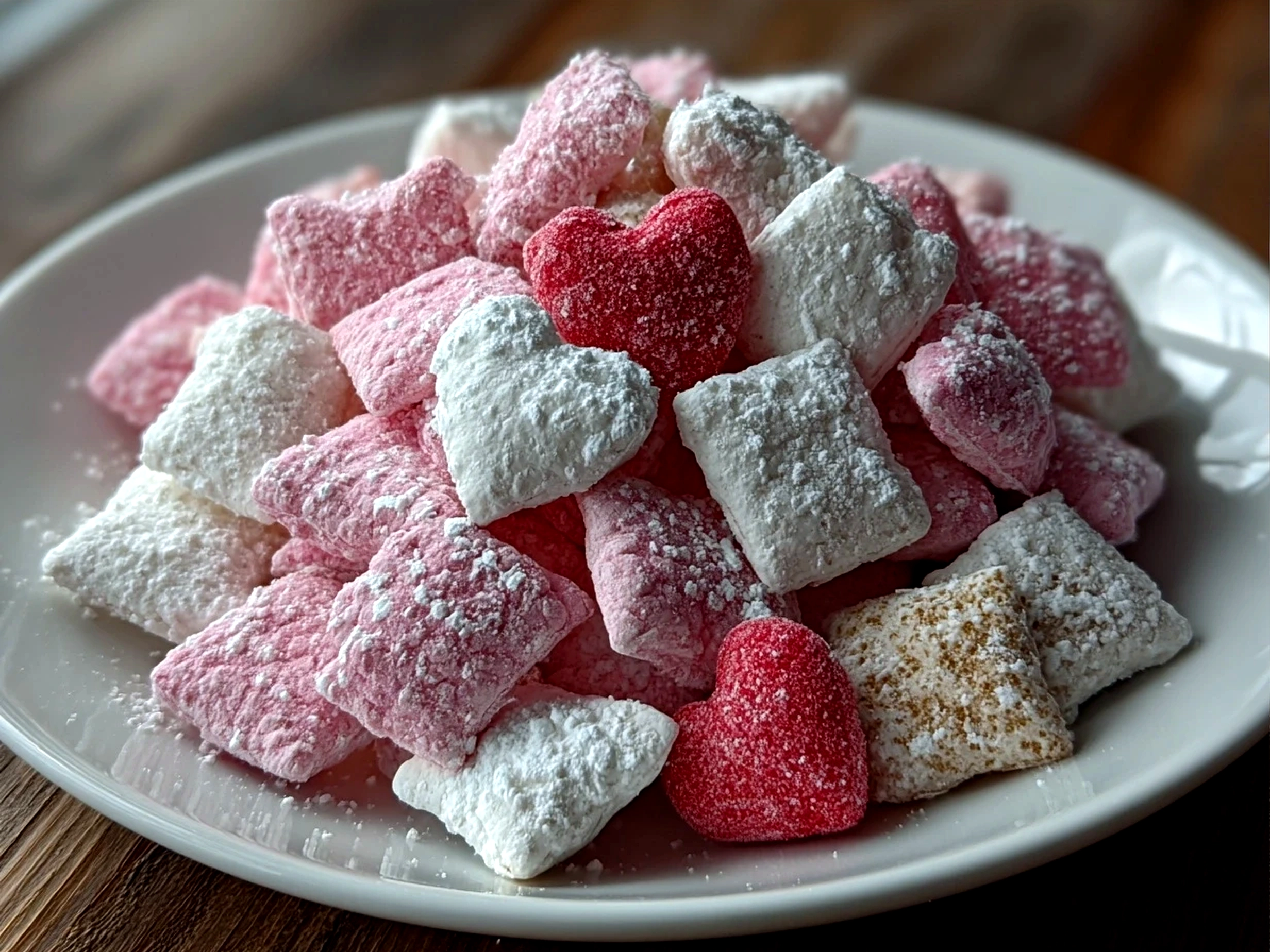 Try serving your Valentines Day Muddy Buddies alongside a simple cup of warm milk or hot cocoa to make snack time feel like a little celebration. It’s perfect for those sweet moments right before homework or during family movie nights.