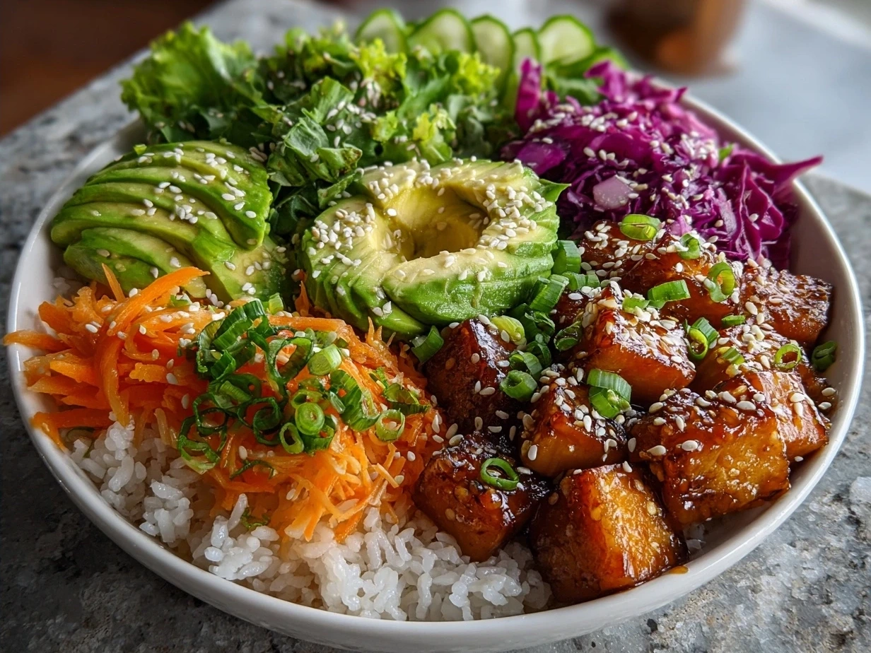 - Top rice with marinated tofu, avocado slices, cucumber, shredded carrots, edamame, and green onions.